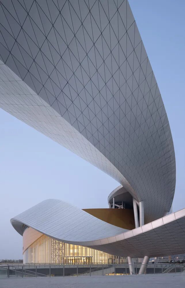 高低两条钢结构飘带交织成极具标志性的建筑特征,既是大剧院的屋顶也是博览中心的侧壁。