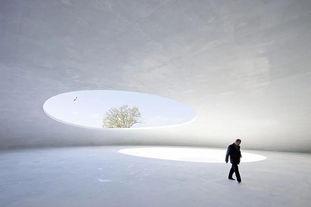 丰岛美术馆整体看上去纤细有力,为了适应周围起伏的地貌,更精准地诠释水滴的形态,西泽立卫选择壳结构作为设计方案,25厘米厚顶部带有开口的混凝土壳,内部是40m×60m的巨大空间,如此大跨度的建筑,没有任何梁柱,丰岛美术馆被认为是历史上最低的壳结构建筑。