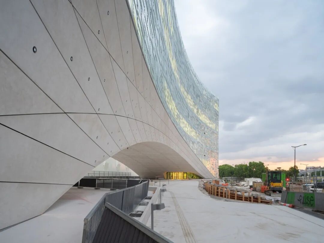 该建筑是主干道南侧办公楼序列的开始,它采用平行四边形的形式,从中挖出一些球形或圆锥形的体量,将它们的形式借给外墙和一个80米跨度的拱门悬在公众可以进入的河岸边,大胆而创新。