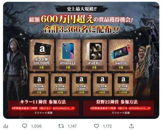 更狠的还有,网易在发行《黎明杀机》手游的时候,也整了一波奖品大活,3366人瓜分600万日元奖品,其中头奖是“6人x10万日元”的亚马逊点卡,其余奖品除了几个实物,放眼望去全是不同面额的亚马逊点卡。