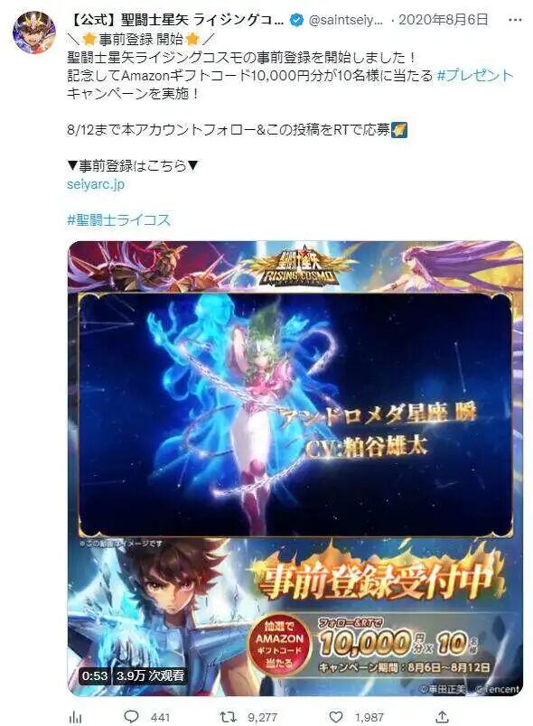 逐渐,在厂商们尝试扩大奖励规模的过程中,“10x10000”这个公式被逐渐沉淀下来,比起早先五花八门的面额,10人份的10000日元看起来要吸睛得多,做成广告语也显得气派得多。比如腾讯发行《圣斗士星矢》的时候,就在开启预约节点用到了“10x10000”模板。