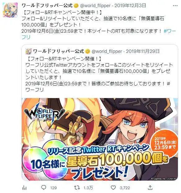 这一波又一波的撒钱操作,也影响到了不少日本本土产品的推特运营策略,前年的黑马《红烧天堂》曾尝试过“100x1000”的发奖策略,《钢之炼金术师》手游预约期间,也配合小节点做过“200x500”的抽奖活动,他们整体上,侧重点都在于“给更多玩家中奖”。