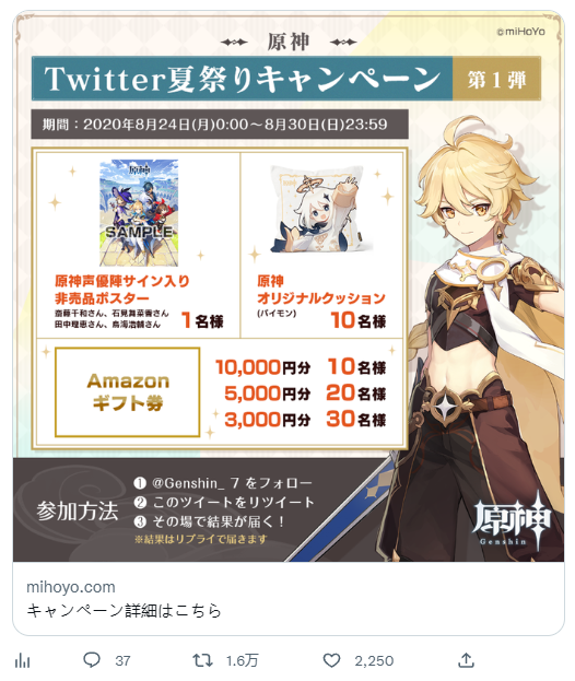 而配合游戏上线,这批推特夏日祭抽奖活动连续举办了数次,每次都更换新周边、刷新奖金池。要知道,此前有部分产品会以“最高xxxx日元”,或者是同一个奖池反复转发让人误以为奖池丰厚/有多次抽奖,《原神》直接刷新奖池的手笔,也与其他游戏拉开了差距。