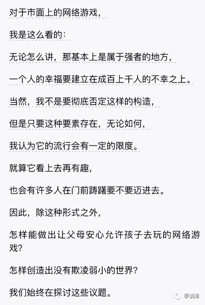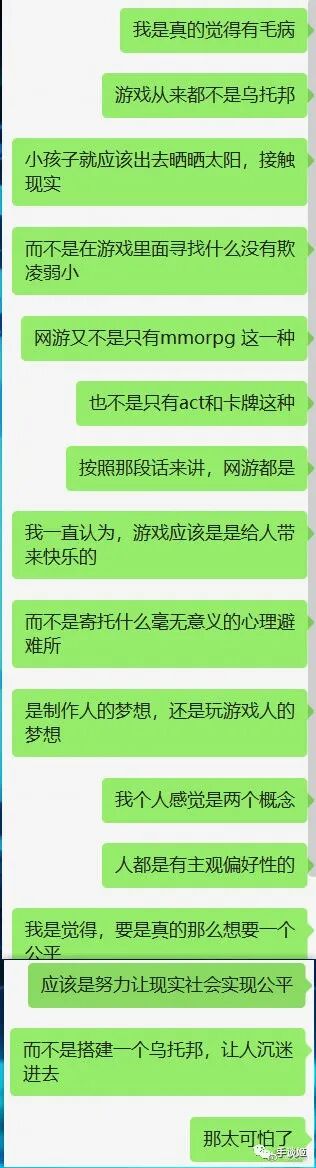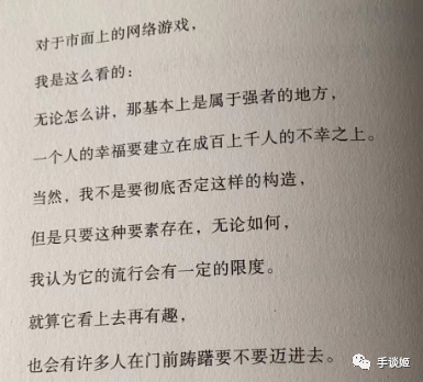 说一个名叫“某某游戏行业群”的群聊中,有人发了张书页的照片。书上写,作者认为网络游戏是属于强者的世界,建立在最弱者的不幸之上,他想要创造的是没有欺凌弱小的、让父母能安心的世界。
