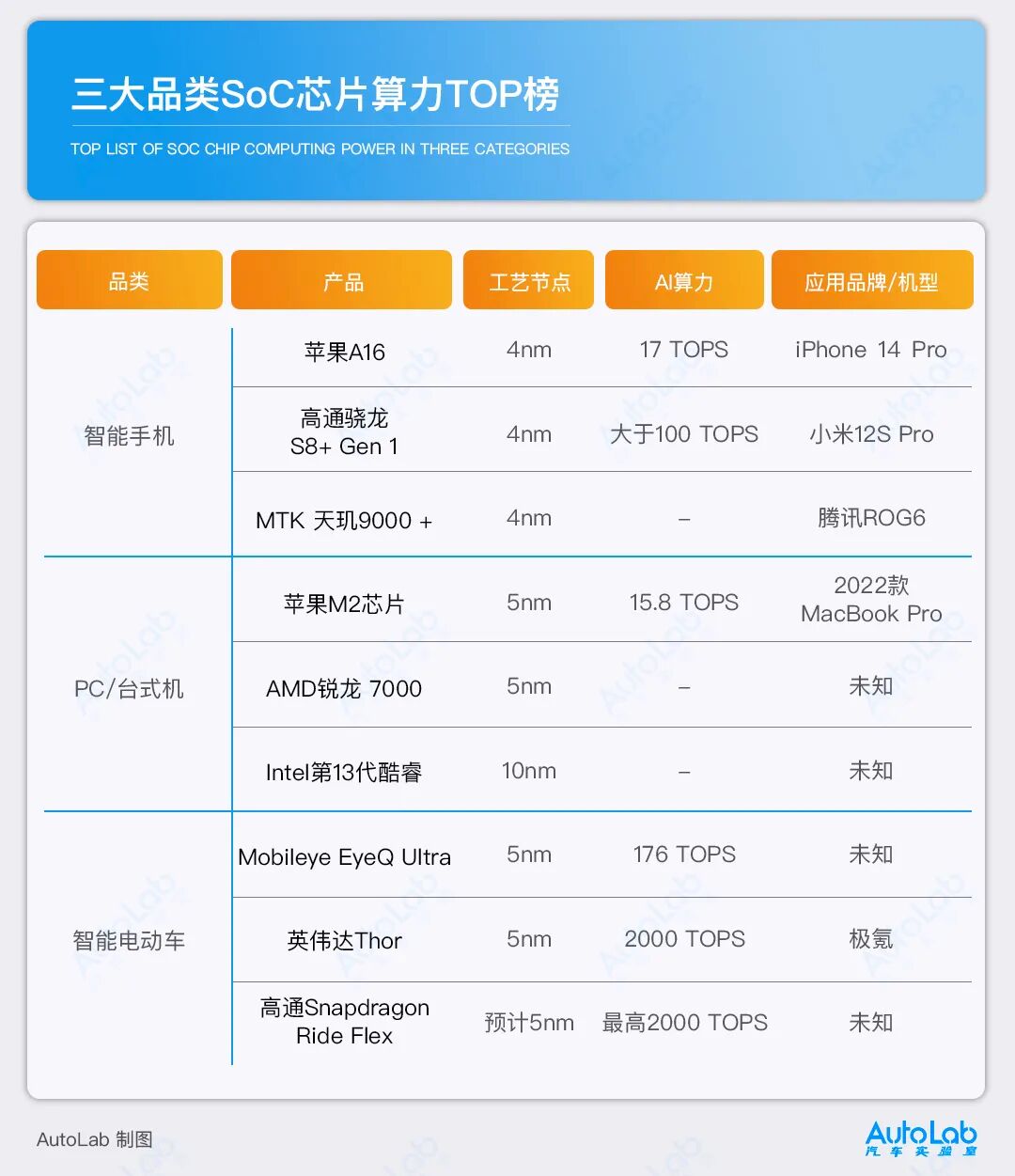 如上图所示,在智能手机、PC等终端的芯片算力竞赛中,智能汽车无疑将是“屠榜”者之一。