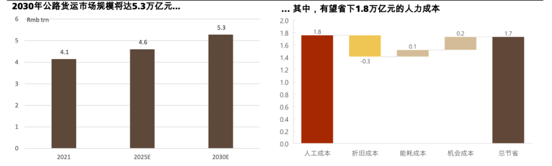 2)成本更低。发展自动驾驶的初衷是实现无人驾驶,解放双手,以及解决如公路货运的人力缺口、物流成本等痛点问题。据瑞银预测,从2022年到2030年,中国整个自动驾驶路侧的投资大约会有1.7万亿元,相比之下,仅公路货运降低的人工成本就能达到1.8万亿元;