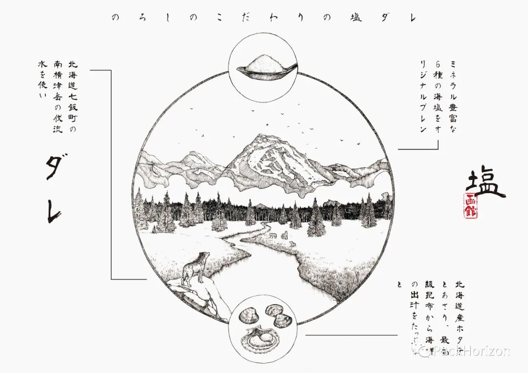 Noroshi 是一家日本拉面餐厅,自 2014 年以来一直供应来自北海道函馆的当地面条菜肴。函馆以其丰富的水产而闻名。Noroshi 希望把当地的风味带到东京,我们根据这一想法创造了一系列设计,以体现每种材料材的特性和来源。日语字符のろし(Noroshi)表示烟雾信号。