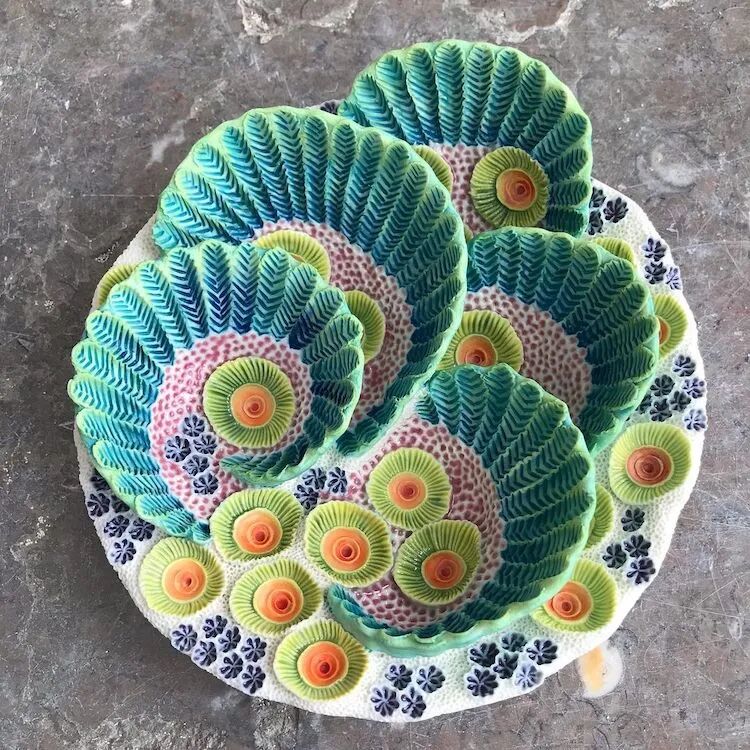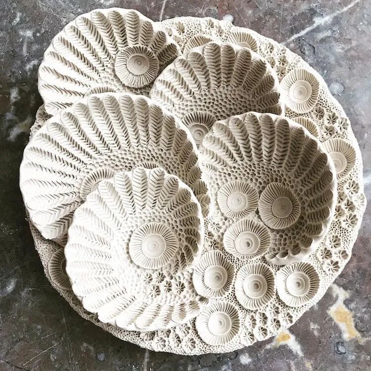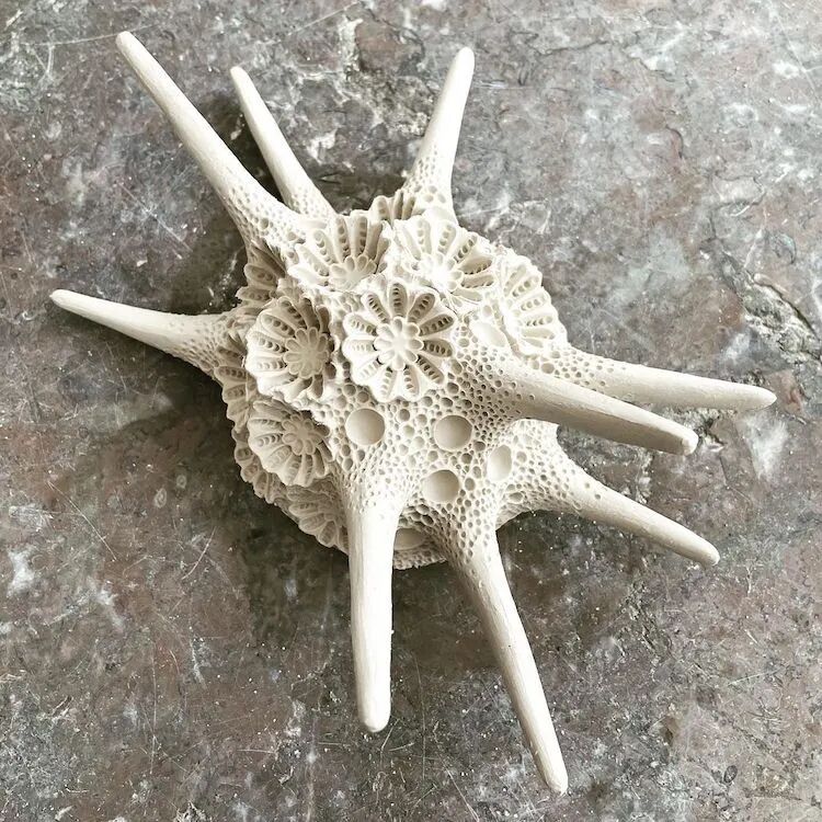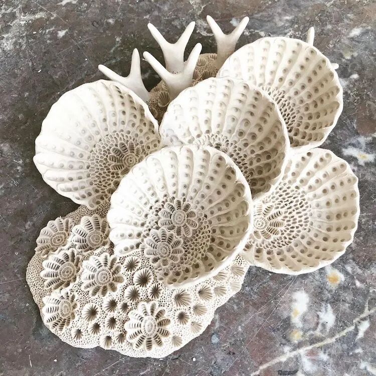 原来,这位陶瓷艺术家的创作灵感来源于自然界中的有机图案,陶瓷造型的想象力来自珊瑚礁、苔藓等自然资源,而她创作的颇有争议的陶瓷雕塑,其实是在模仿水生生物。这样一来,人们或许就能明白,这些作品为什么有贝壳和珊瑚礁的形态了。