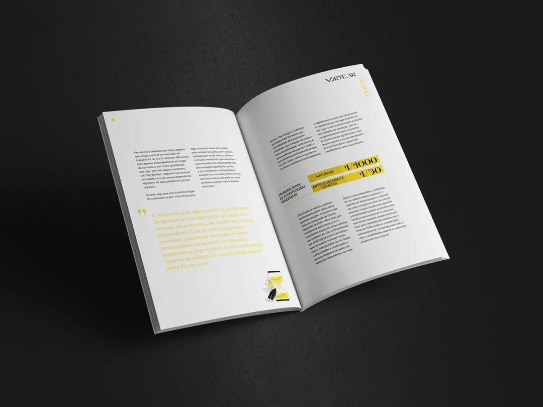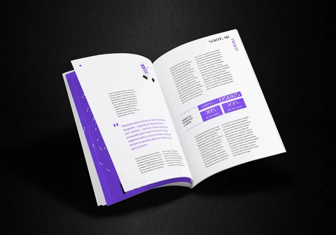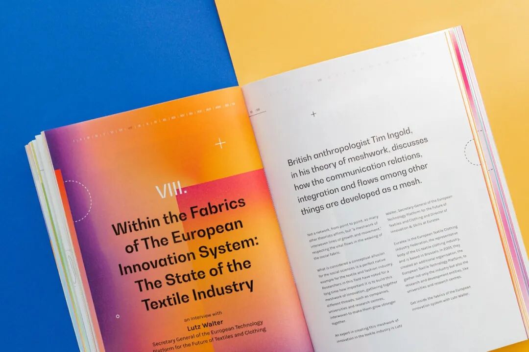 考虑到出版物的名称(norte.ar 可以被理解为向北/向前)和构建新未来的概念,我们创建了一组可以转化为导航系统的元素:指南针升起带路,以及类似于导航地图中的网格。通过颜色和图形元素来区分它们,再运用在封面、章节页,甚至延伸到其他内容中。