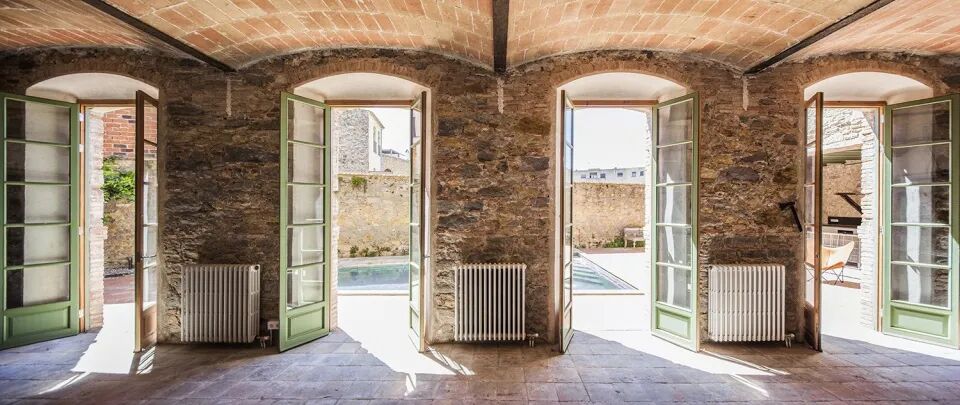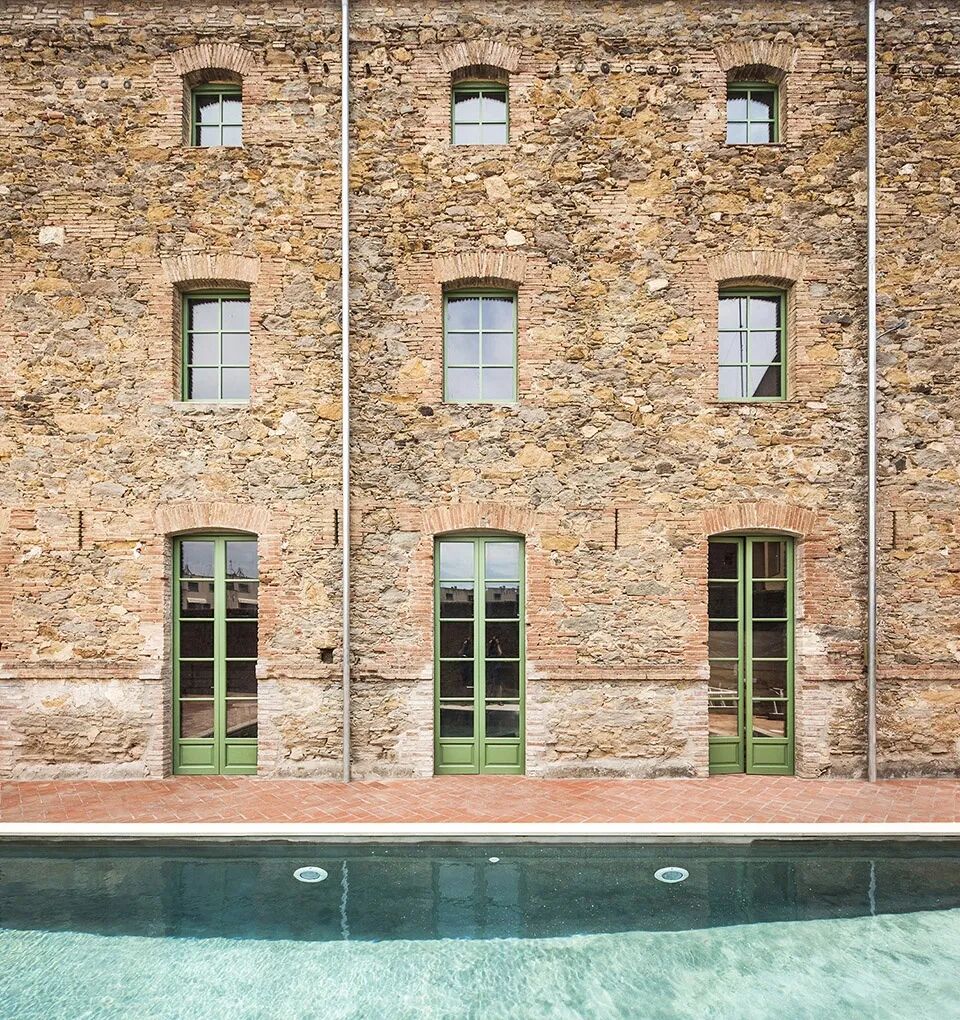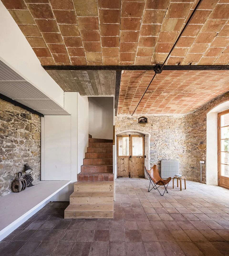 这个住宅位于西班牙小镇La Bisbal,原址是通向老城主干道上一座巧克力工厂的小型仓库。是一个有着石砌立面的三层建筑,一层是由金属梁支撑的加泰罗尼亚拱构成;二层是由金属梁及精美的木质框架共同搭建;三层则是采用大型原木支撑起一块由砖块拼接并覆盖有瓷砖的薄板。