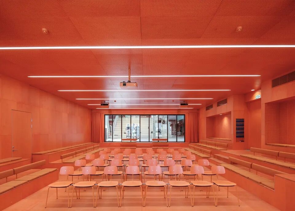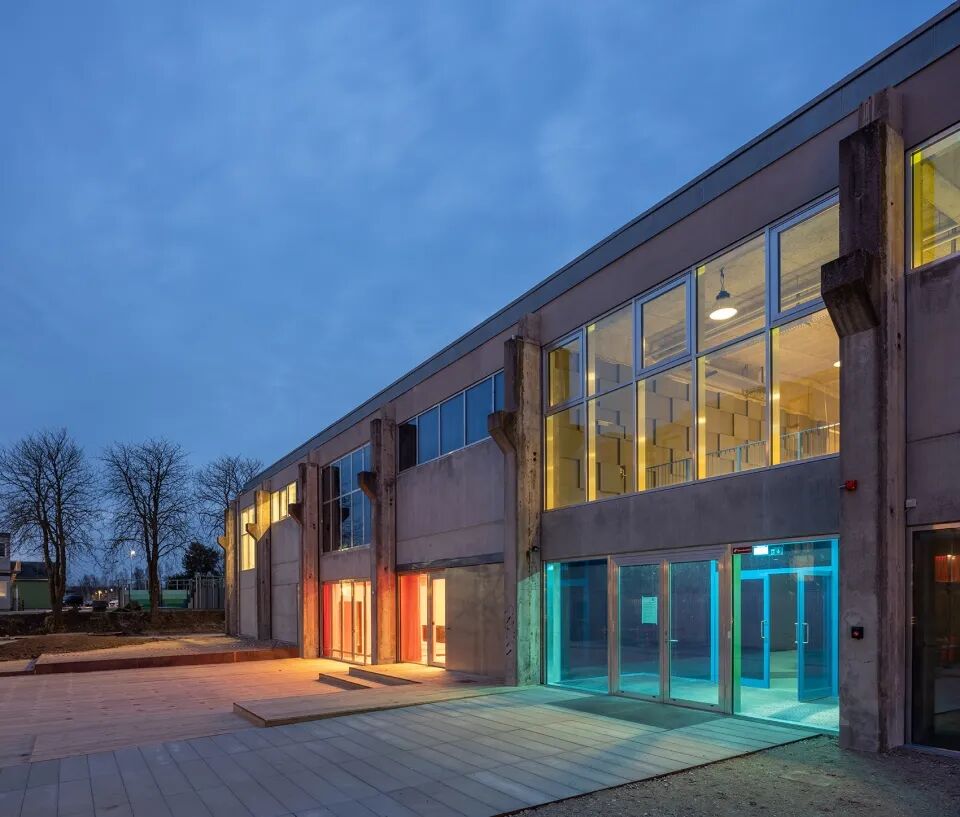 教学楼保留了原工厂的混凝土外观、混凝土立柱和屋顶,但对内部的墙壁和空间规划做了更新改造。设计以“盒中盒”为概念:外形像仓库的彩色模块相连,沿着主线从建筑一侧到另一侧布置,在这条主线上有一个作为学校公共活动中心的木制看台。