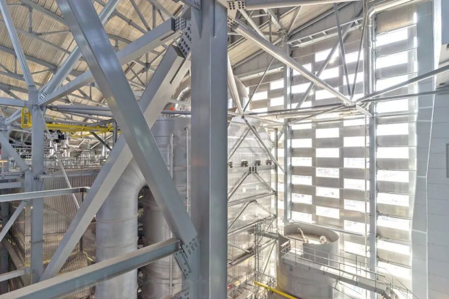 作为一座垃圾发电厂,它的外观完全区别于我们的固有印象,124m 的高度,形状如同一座倾斜的山坡,在阳光下闪闪发光。外立面由高 1.2m、宽 3.3m的铝砖单元堆叠而成,玻璃窗镶嵌其中,为建筑内部也带去了自然光线。