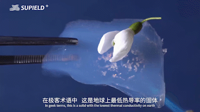 而除了轻,这种材质的导热率(0.013W/m·k)非常低,甚至比空气(0.026W/m·k)还低,致使有着非常夸张的隔热性以外,更有着使热量几乎不会被传导的特性,简单说,气凝胶独一无二的特性在于:隔热、保暖!