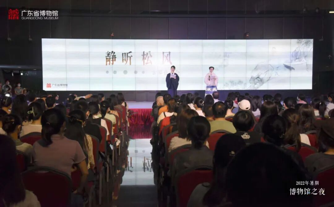 “2022年暑期博物馆之夜”系列活动之“静听松风——古琴音乐会”,邀请数位青年琴家和学者联袂演绎《良宵引》《水仙操》《梅花三弄》《鹤鸣九皋》《流水》等古琴经典名曲,还有昆曲《惊梦·绵搭絮》唱段的演出。除了大堂的音乐会之外,我们还在展厅中推出了沉浸式古琴文化艺术体验活动,观众可以边逛琴展看文物,边赏琴曲品琴音,展演结合,调动视觉、听觉、触觉,沉浸式体验古琴音乐艺术,走进古代文人的精神世界。