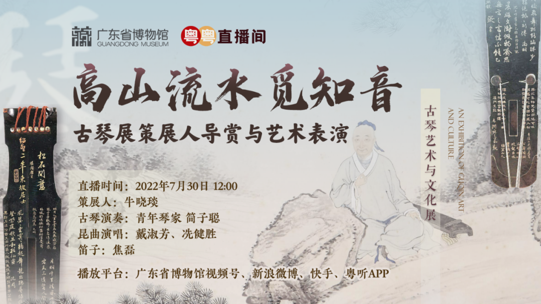 7月30日(周六),广东省博物馆微信视频号、新浪微博、快手,粤听APP等平台推出“高山流水觅知音——古琴展策展人导赏与艺术表演”主题直播节目。