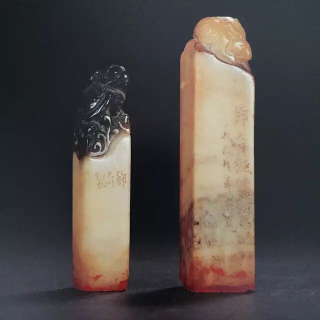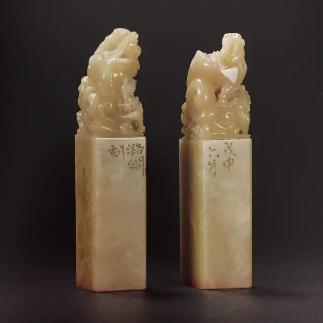 叶潞渊刻青田石双龙戏珠钮闲章一对