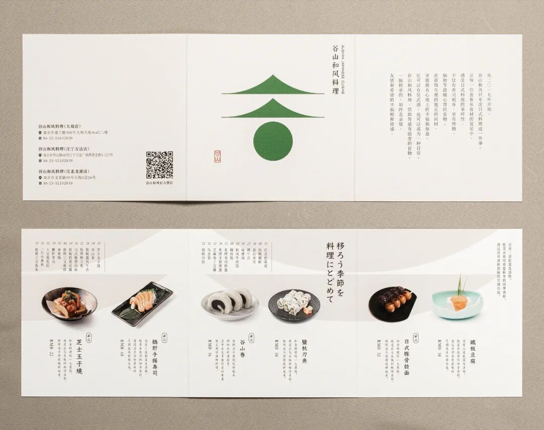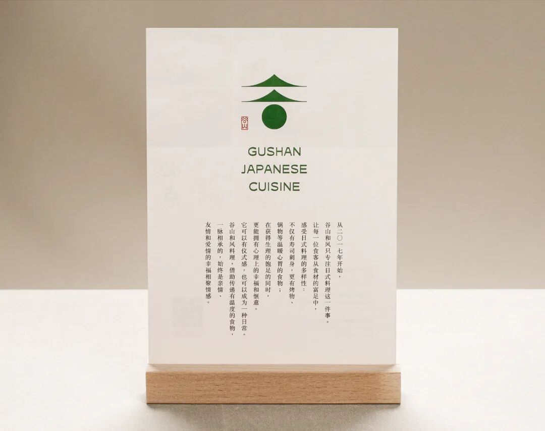 作为一家日式料理店,简约宁静的氛围是内核,利用墙面和地面大面积的灰色铺垫开阔且质感十足,超级符号精细独到的写意,打破了沉闷压抑,在灯光的渲染下营造出幽静雅致的空间感,充满禅意。总结:品牌的背后是品类,品类的背后是文化,文化的背后是美学。用文化+美学打造品牌的方法,才能深入人心,降低消费者的记忆成本,并且在未来的很长一段时间内能顺应时代变化、立足市场。尊重品牌和文化,但不是照书原样搬运,我们通过追溯日本料理的历史文化源头,提炼出和食的核心 “米”,米即稻谷,谷又是品牌首字,所以我们以“谷”为基础进行演绎和延伸,再次强调了品牌名称,同时搭建起一套独特的品牌视觉体系,打造品牌“传家宝”。谷山品牌:让每一位食客从食材的富足中,感受日式料理的多样性。不仅有寿司刺身,更有烤物、锅物等温暖心胃的食物;在获得生理的饱足的同时,更能拥有心理上的幸福和惬意。我们也希望谷山全新的品牌形象的运用能开启更多人对品质健康生活方式的追求以及日本饮食文化的独特体验。