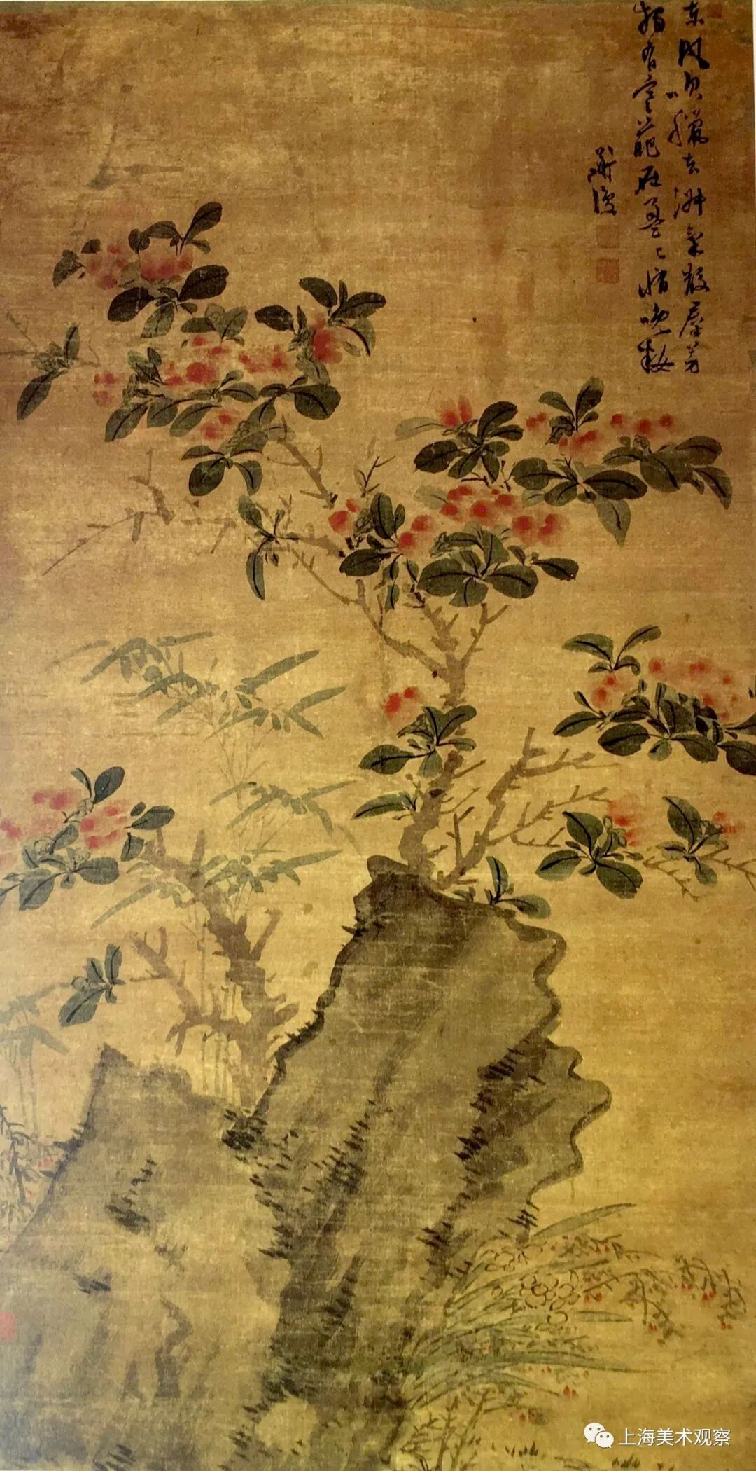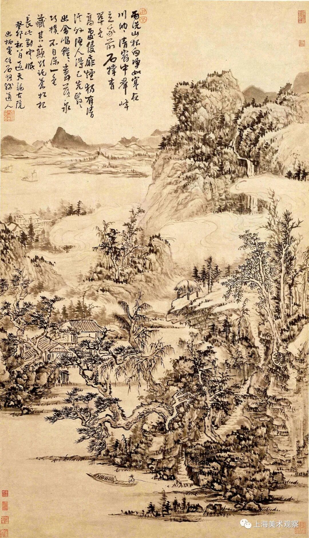 杏花、春雨、江南的意象组合,应该是王翚心中最美的意境。《杏花春雨江南》作于康熙二十九年(1690),时王翚59岁,正是个人创作最佳时期。整幅画设色淡雅,用笔秀逸脱俗,图中山峦层叠,小桥流水,树青草绿,淡粉色杏花点缀其间,清新淡雅,一派雨后春光明媚的江南山村景致,极具生活气息,颇有世外桃源之逸趣。款字是明代文彭所作《和倪元镇江南春辞》:“节序相催将迸笋,青春白昼帘珑静。廻塘鸥鹭浴相喧,照水鸳鸯娇弄影。荡子未归春服冷,佳人自汲山前井。谁家青鸟啣红巾,银鞍玉勒随香尘。春色好、春光急,朝烟未散山犹湿。山行应接不暇及,山下湖光静凝碧。三月游船尽倾邑,向人语燕樯头立。游丝网花落池萍,流年一去谁能营。”风格近文彭、唐寅,淡雅精致。