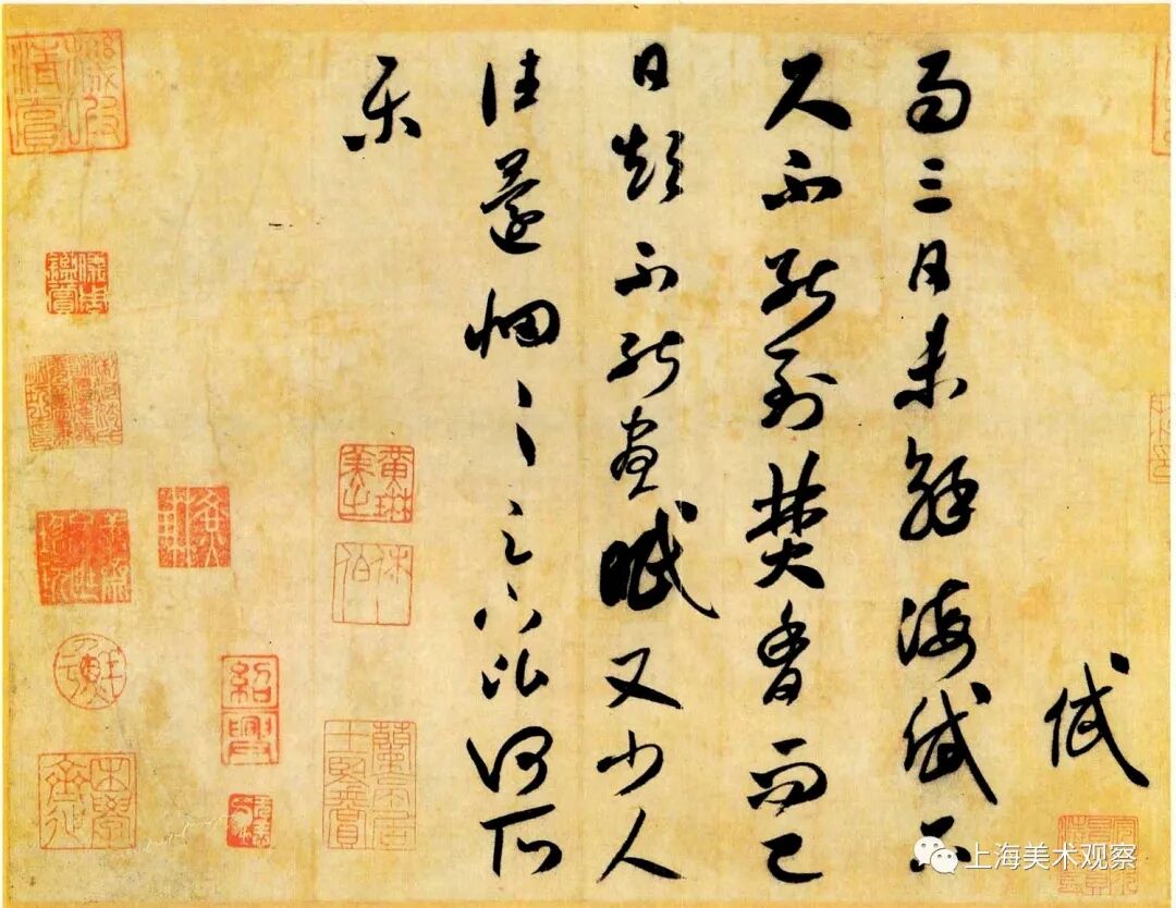 如果要从琳琅满目的书画作品中精选出一件作品,作为“雨水”时节的象征物,莫过于米芾《值雨帖》:“值雨。草草。不知轴议何者为如法。可换更告批及。今且驰纳。”米芾大多尺牍开头一般用“芾顿首再拜”,此札中“芾顿首。早拜见”极少见。全篇大意是:“早上拜见您,正好下雨。草草而过,不知道讨论的核心话题怎样才妥当的,若要更换的话,麻烦批示给我,今天将能够奔赴收取。”需要指出,“轴”字尚有“病不能行”的意思,因而《值雨帖》中的“轴议”,也可能指讨论某人因病而不能行事。此札约书于1103年,老米时52岁,风格已成熟。米字沉着痛快,恣肆豪放,八面出锋等特点跃然纸上。用笔迅疾而劲健,尽力、尽势、尽兴,痛快淋漓、雄健清新的气势太险、太美、太绝,结字自由放达,天趣抒发。