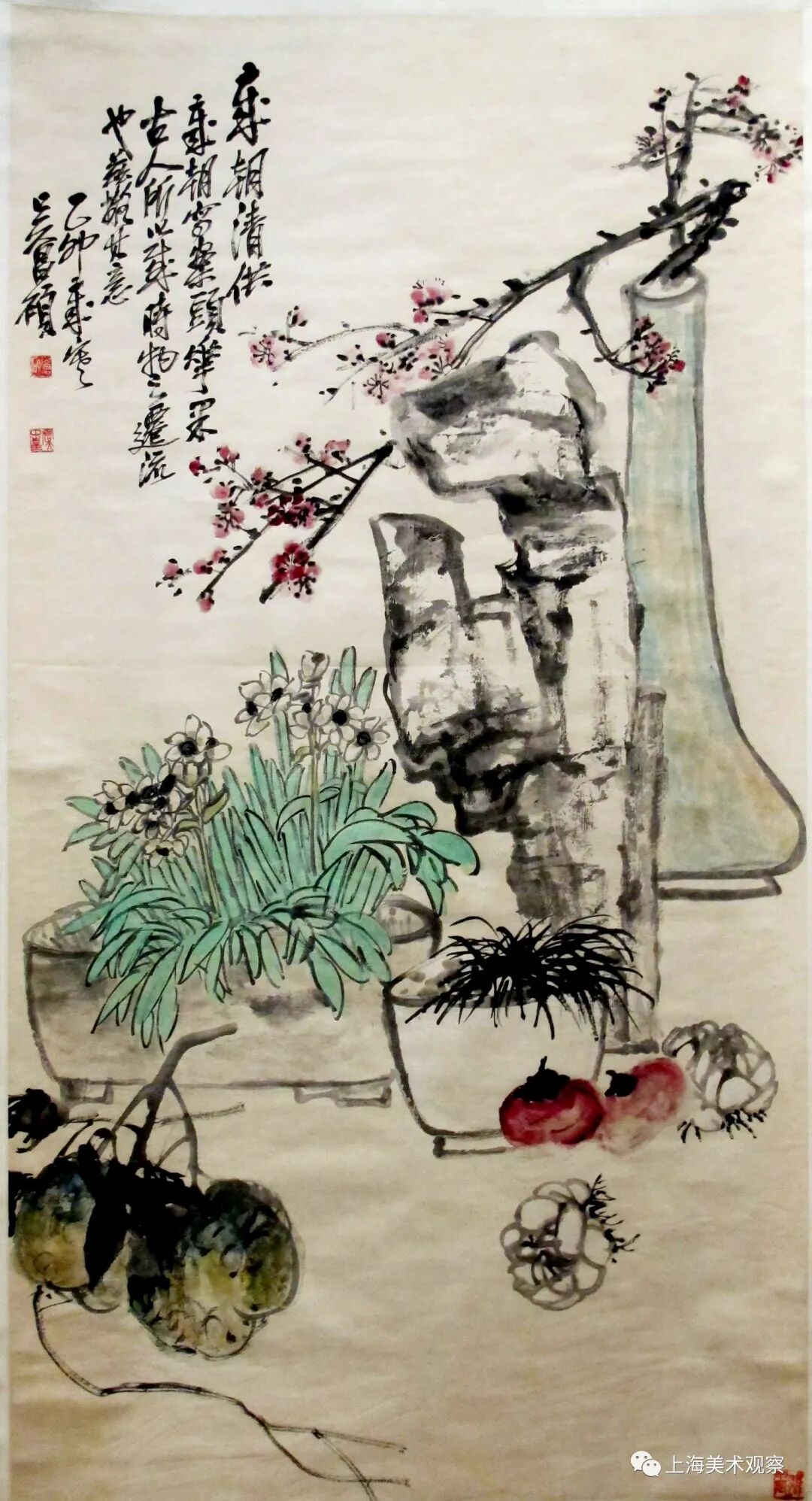 如前所述,水仙花开正是雨水时的自然现象。吴昌硕喜欢画“清供图”,水仙时常就是主角,读此画,可见极为随心所欲,信手拈来,除了水仙作为笔下意象之外,时而是牡丹、荔枝、佛手挤在一起,繁复艳丽,时而又一枝莲花,一壶香茶,简约明快,时而觚觯尊罍,花果飘香,时而又梅兰竹菊,济济一堂。《花卉图》中的水仙有“神仙”之寓意,水仙绿叶仙姿,叶片以墨笔勾线,石绿填色,浓厚的色彩增添了鲜活生机,一枝一叶,无不精神饱满,所用各色俱各自然而能不落于清新平薄,即便大红大绿亦复有变化,不落于脂粉俗艳,用色复杂,能在变化中实现统一,既丰富又沉稳,重色之斑斓浑厚与大气磅礴之画面极其协调。画家以意造为法,达到了“心神默”与“造化能”的境界,构图独具匠心,富于变化,情趣盎然。左上方题款:“岁朝清供。岁朝写案头花果,古人所以感时物之迁流也。兹拟其意。乙卯岁寒”,吴昌硕时72岁,正是创作的巅峰期,元气淋漓,气足墨酣,内涵深厚,富金石之气,使观者为之心壮。
