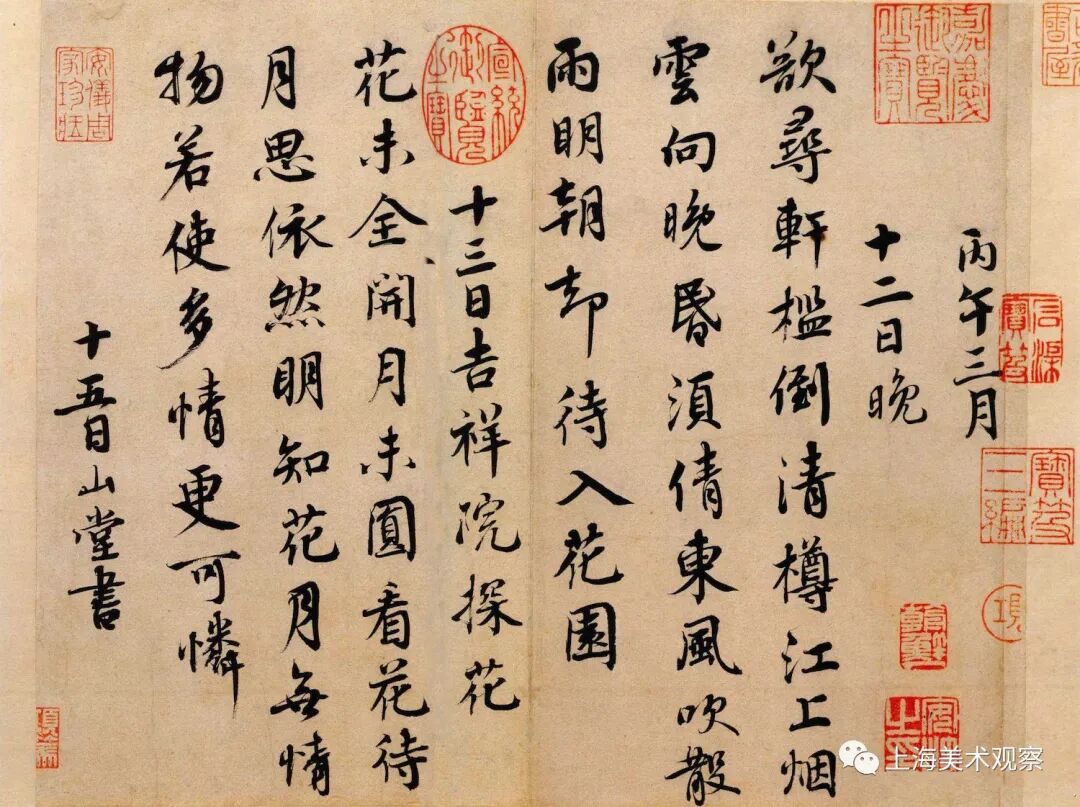 蔡襄《山堂诗帖》中有两首诗,前半部分有句:“欲寻轩槛倒金尊,江上烟云向晚昏。须倩东风吹散雨,明朝却待入花园。”人生如梦,仕途多艰,但仍需有一份憧憬。蔡襄的字,一如既往地精严端庄,温文尔雅。