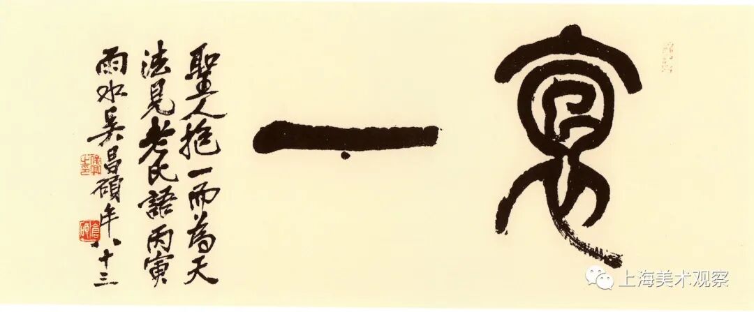 丙寅雨水书“抱一”为吴昌硕83岁所书,功力炉火纯青,笔墨老辣苍茫,浑厚有力,率意之极,不拘一格。