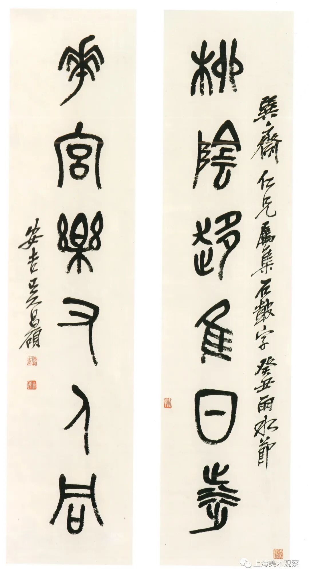 说到任伯年,必然要言及亦师亦友的吴昌硕。吴昌硕和邓石如近似,带有庶民气质,但他们骨子里仍然是一个文人。邓、吴两人唯一的差别在于,五十六岁的吴昌硕在同乡丁葆元推荐下,以扬州盐运署幕僚的身份,补涟水县令之缺,就是米芾曾经呆过的地方。因为无法忍受官场俗套,最终只能刻三方“一月安东令”,挂冠而去。在吴昌硕的书法作品中,找到和雨水节气有关的作品几乎毫不费力,对一个创作极为勤奋,作品量大质高的大师级人物来说,堪为后世楷模。癸丑雨水书“柳阴趍惟日涉,花宫乐有人同”篆书联,为吴昌硕70岁时所作,字形多为正方,用笔尚有拘谨之色,整体上仍有一些刻意,可见积累求变非一日之功。