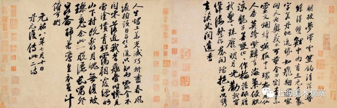 “北宋四家”中,苏轼书《李太白仙诗卷》中有句:“人生烛上花,光灭巧妍尽。春风绕树头,日与化工进。只知雨露贪,不闻零落尽。”字里行间,透露出对人生如雨露,短暂即逝,零落黄泥的感慨。有人以为,据其中关键字眼来看,此诗非李太白所作,然亦非庸笔。苏轼此帖,字迹神采飞扬,用笔率意,字形跌宕,全篇神完气足。