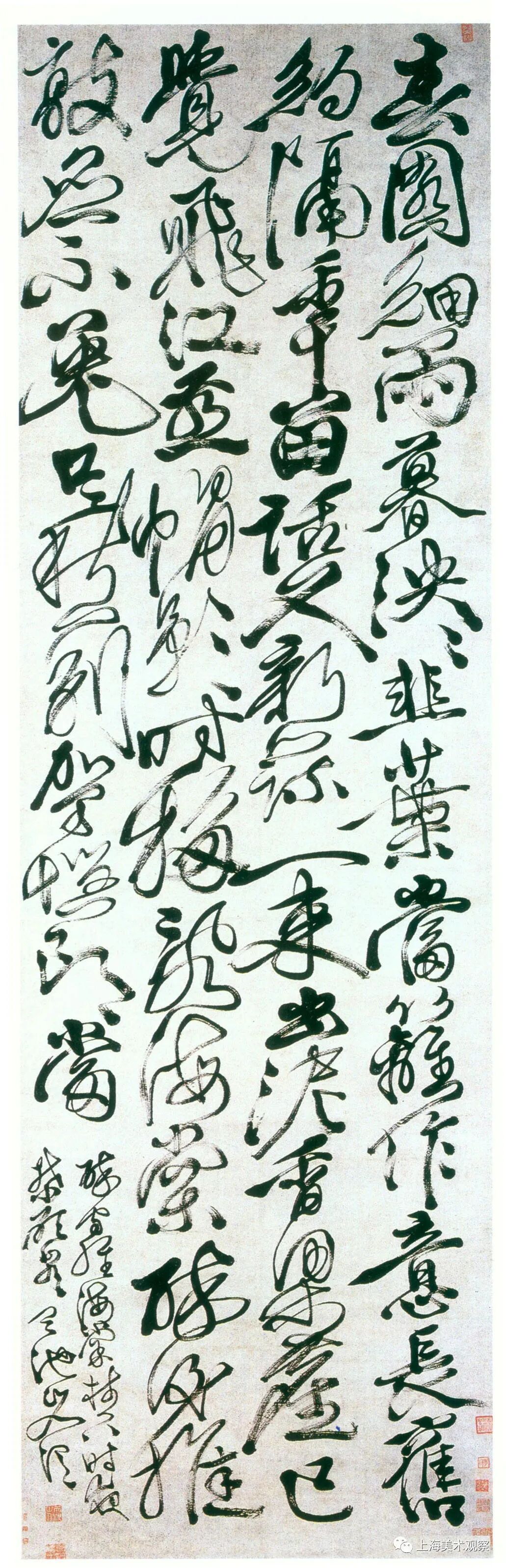出生绍兴的徐渭,与唐寅类似,人生处于失意状态。虽然原因不同,但结果是相近的,与官场决裂,成就艺术人生。两人书风截然不同:唐寅虽失意而颓唐,最终走向平和,徐渭则表现为激越、叛逆,从《春园细雨》七律诗轴和《春雨诗帖》长卷等两件作品便可窥豹一斑。无论是“春园细雨暮泱泱,韭叶当篱作意长。旧约隔年留话久,新蔬一来出泥香。”还是“春雨剪雨宵成雪,长堤路滑生愁绝。军中老将各傅书,二十四蹄来蹙铁。”读起来无不有苍凉之意。如果要在明代艺术史中寻找一位人物,可以与整个时代划等号,那便是徐渭,一个艺术大才、全才。终其一生,充满悲剧色彩,然徐文长“乐难顿段,得乐时零碎乐些”,有着自己的人生哲学和思考,在艺术创作中成就了自我。