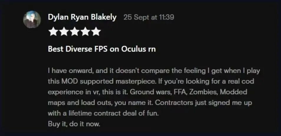 如果查看玩家对《Contractors》的评论,我们会看到与《BONELAB》相同的内容:几乎每条评论都将游戏Mod作为购买游戏的理由。游戏官方对UGC的支持,让《Contractors》中充满了几乎无限的游戏内容,而这些内容均由充满激情和才华横溢的玩家群所创造。