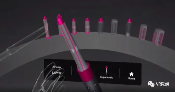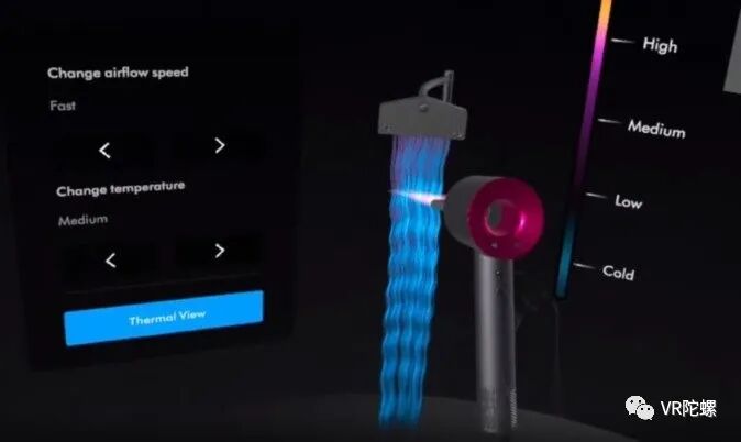另外,在该体验平台中,每个产品都是3D的,用户可以用控制器抓住它并检查细节。比如用户手里拿着一个吹风机,风的流动就会以动画的形式展现出来,用户就可以看到它的强劲程度了。用户还可以组合附属部件,体验热空气的流动变化情况,还可以进行风量强度和温度等微调。