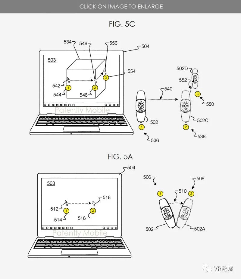 在谷歌的专利图5C中,用户可能正在使用空中鼠标设备#502来访问Chromebook中用户界面(#503)的软件和3D内容#534。空气鼠标可以在空间中从左到右向前移动,以引起配置在计算设备上显示的虚拟空间中移动的2D或3D鼠标光标的位置的比例变化。按照下面的空气鼠标(1)、(2)和(3)的移动位置以及Chromebook显示器上的相应移动,可以看到这给3D图像工作带来的特殊能力。
