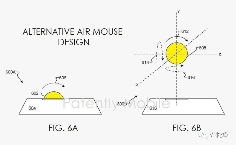 在谷歌的专利图6A和6B中,我们可以看到一个可移动轨迹球形式的空中鼠标的替代设计。该球体位于触控板的上方,但可以被移除,为用户提供一个额外的尺寸。用户可以向左、右、上、下、前、后移动轨迹球#608(图6B),包括倾斜、旋转、旋转运动,以在如三维空间等环境中影响内容的移动。该运动可以是一对一的运动,用户在空间中移动轨迹球,内容在计算设备中移动相同的距离(或根据轨迹球的物理运动,移动预定的比例距离)。
