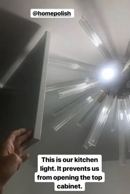 1月31日,人气博主伊拉娜·怀尔斯(Ilana Wiles)发布了一篇谴责Homepolish的博文,在贴出的二十多张照片里,她展示了自己位于曼哈顿的公寓被Homepolish装修得如何拙劣,下图为厨房里的吊灯甚至挡住了顶层的橱柜。
