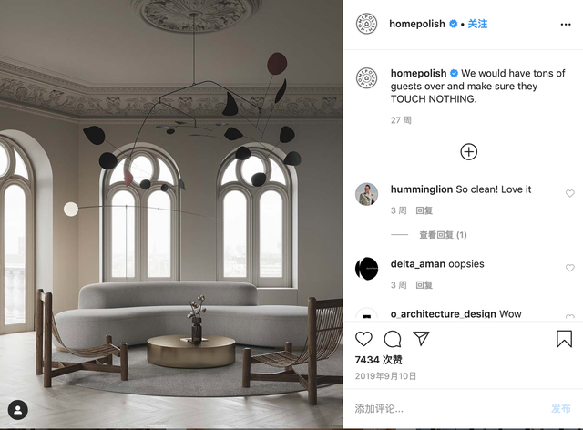 Homepolish发的这条Instagram展示的是一张客厅的照片(相信设计师们都很熟悉这张图)不过令人遗憾的是,这是Homepolish在Instagram上发布的最后一条帖子。
