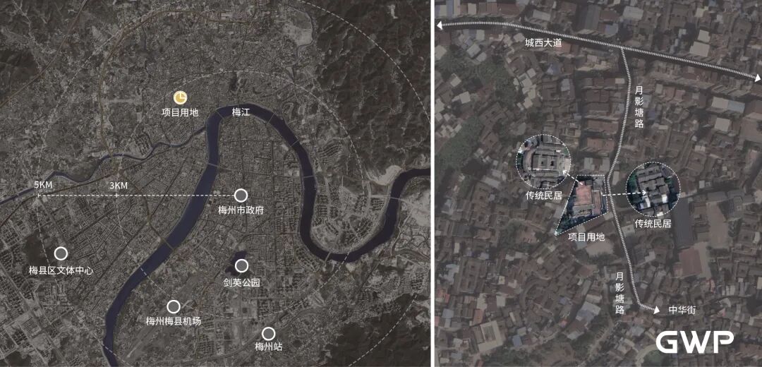 项目周边是典型的由老街和握手楼组成的传统生活街区,密集甚至有些局促的空间里充满了朴实而鲜活的烟火气。其中客家传统围屋、街边的商铺与民居共同刻画着场地的历史与城市记忆。