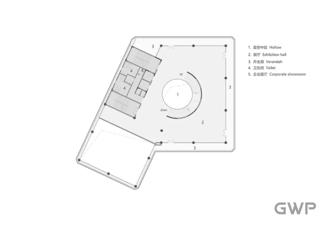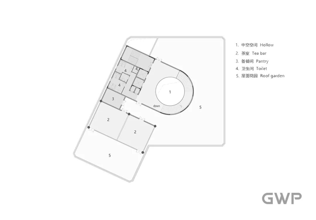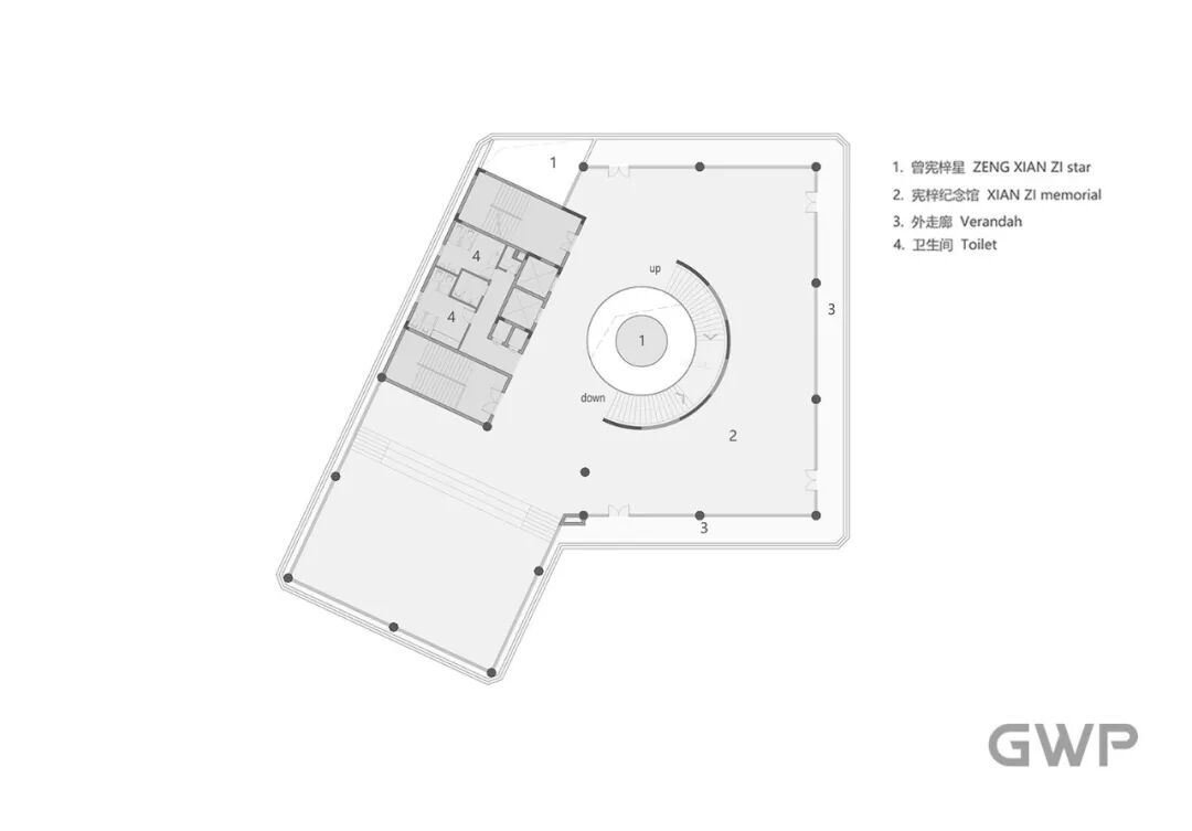 本次设计充分从使用者角度出发,考虑到游客进一步的体验感与活动交流需求,更加完善定义了带有叙事性的空间功能,观展后沿着环状楼梯到达顶层的天面茶室,喃喃风声拂过,游客在品茶中继续回味和俯瞰周围传统街景。
