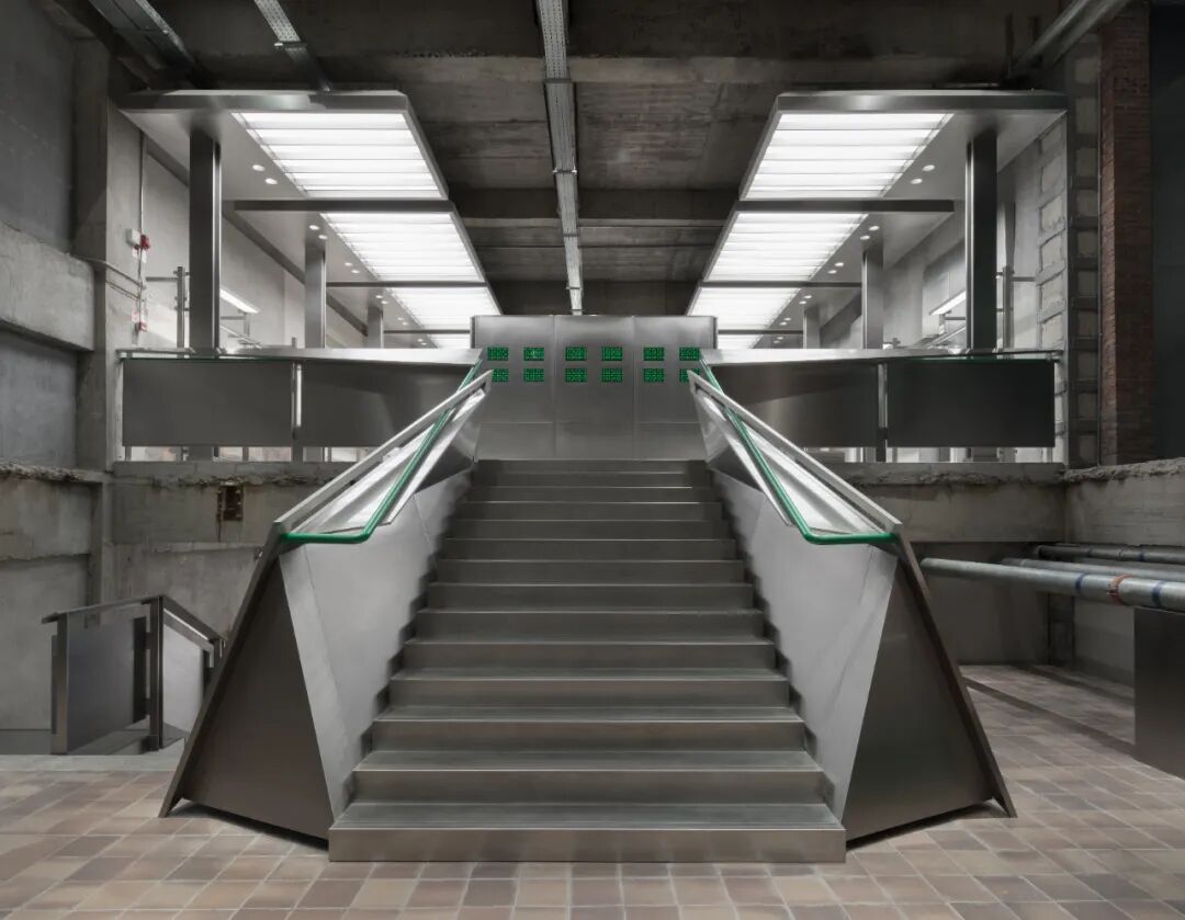 一层至二层之间有一处缓冲区,是整体设计中的第二个复合空间,该自由空间提供着驻足、打卡、社交等功能。原建筑管道的穿梭与物资的堆叠共同创造出一个富有趣味性与忙碌感的场景。