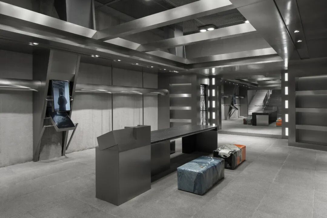 建筑二层为未来枢纽核心区,整体以中轴线对称设计。阵列化的模块照明系统,逻辑化的地面分割结构,如置身于枢纽数据中心,或研究试验场。通过空间、产品及装置的交叠应用,为顾客提供极致的沉浸式体验。
