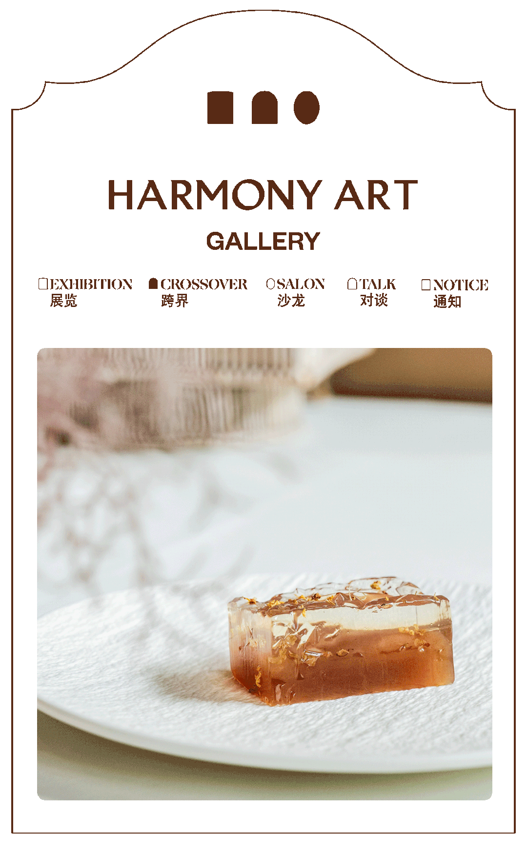 鎌倉製菓主理人Kin曾为HA旗下的诸多展览设计过限定艺术甜品,比如为“色气”展览推出的“凌波”“如梦”两款艺术甜品,灵感来源于艺术家王智一作品《穿插》中极富视觉的几何形状;在艺术家周仰的园林摄影展览“不朽的林泉”中,镜头下园林的宁静与神性融入枝豆海盐卷之中......限定版艺术甜品作为展览的延伸,拓宽着艺术的内容与边界。