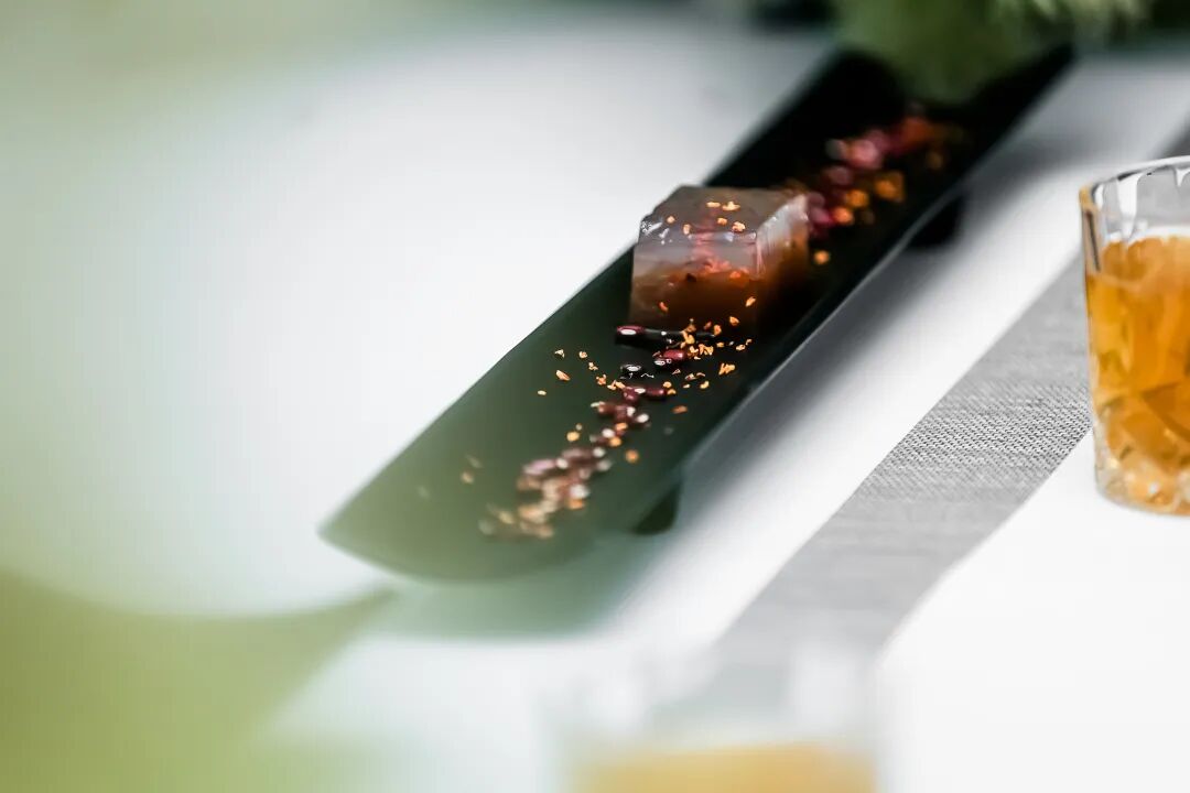锦玉羹、羊羹是两种传统的日式和菓子,一般在夏日食用,符合当下的节气。锦玉羹晶莹剔透的外观与河流也有相似之处;同时,锦玉羹与羊羹的搭配非常契合,所以将它们做了结合。
