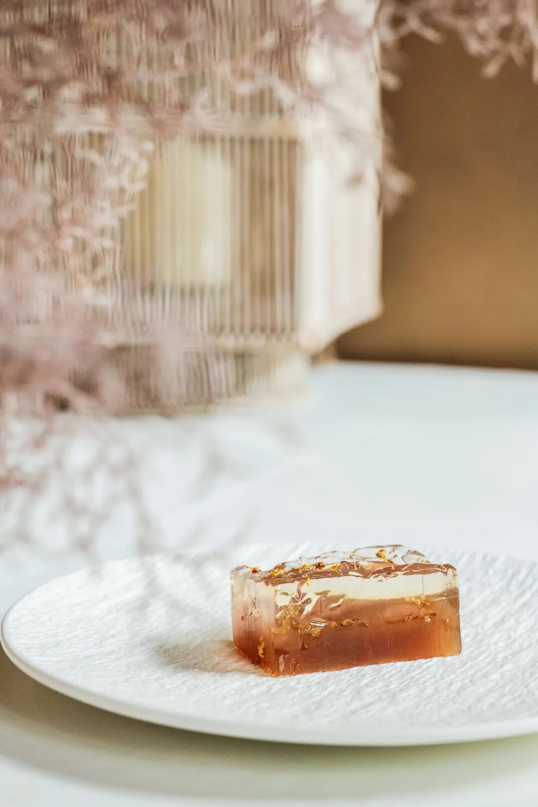 “此河旧影:从繁花到苏州河”展览启发了Kin对于上海城市标志苏州河的思索。为了能重现苏州河河水的波光,Kin将两种日式传统甜品锦玉羹与羊羹相结合,用两种和菓子的透明感表达河水的波光与澄澈,同时意在致敬两位老师在本次展览中的紧密合作。除了富有深意的视觉呈现,在味觉塑造中“苏州和”上层的锦玉羹里添加有香气馥郁的丹桂,下层的羊羹中则加入茉莉,令齿颊中充盈优雅的东方气息。今天,HA将与Kin展开对话,一同了解苏州“和”创作背后的故事。