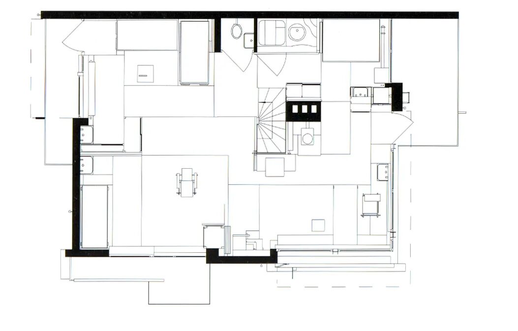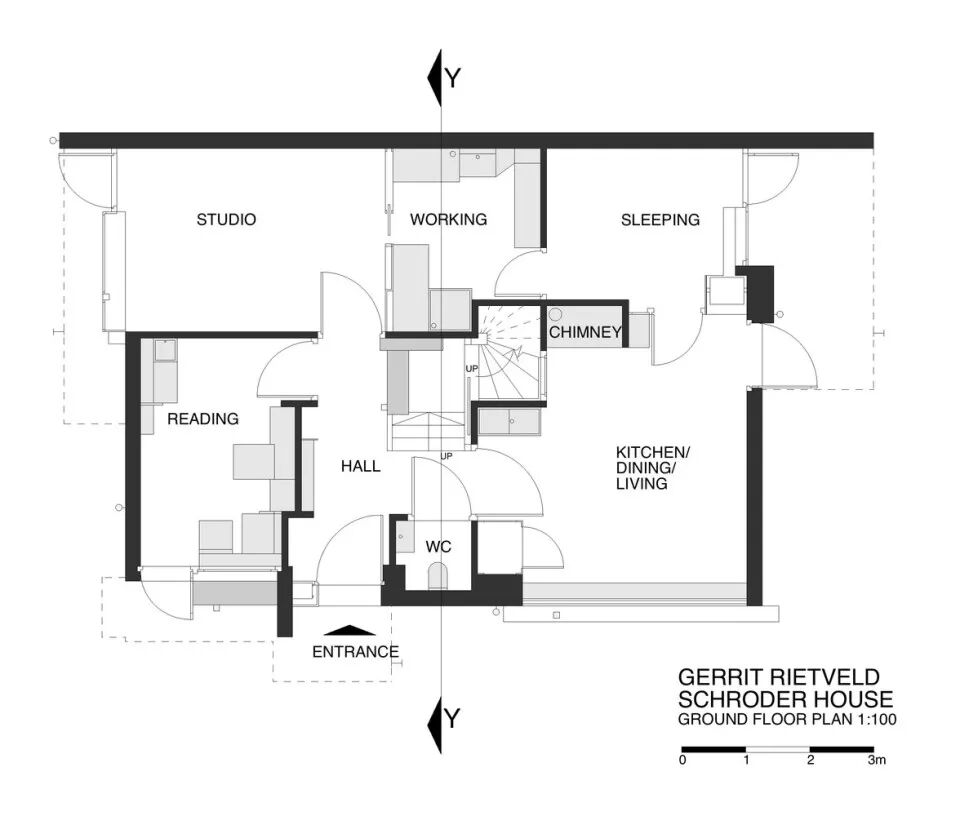 施罗德住宅第一层平面图,尽管面积不大,但包含了日常所需的所有空间。© Great Buildings Online