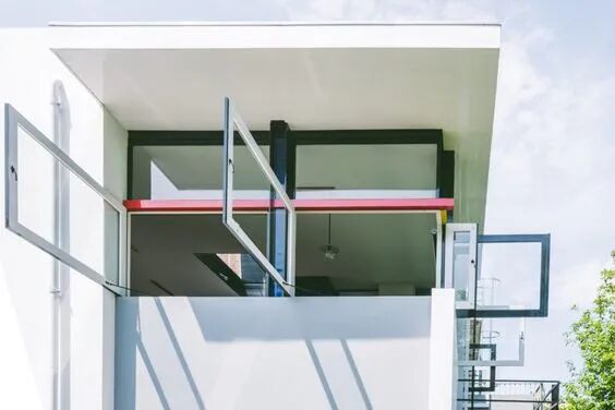 从外观上来看,施罗德住宅的每一个里面都宛如一幅典型的荷兰派风格绘画,行至室内,风格的整体性也得到了绝妙的把控,例如窗户铰链的安装使其能展开至90度,保证了外观横平竖直的统一。