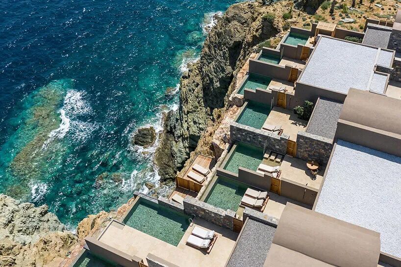 While wellness spaces are carved out of natural caves, stepping terraces and infinity pools are nested atop the cliffy coastline of the Greek island of Crete.