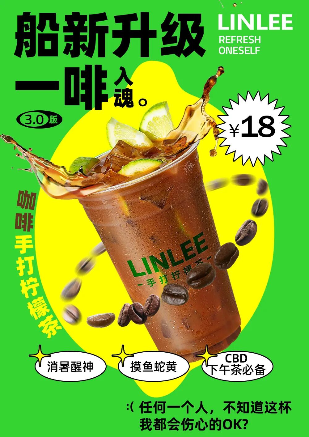 干货2023-12-09 海报很潮但不卖货,有球用 写前叨逼叨:学一种风格容易,但想用好并不容易。 现在做设计,绝大部分的行业都在倾向年轻化、时尚化,如果是专门针对年轻人的品牌那就更加如此,各大品牌都会使劲往潮、前卫的方向做,用各种当下比较流行的设计风格。商业设计要迎合消费者的审美这是合理的,不过前提是要照顾到产品(服务)的属性,比如食品海报就得有食欲、医药包装要给人健康和专业的感觉。 前不久在网上搜奶茶海报,发现这个行业里的设计同质化也越来越严重了,大家都喜欢用最近比较流行的类似扁平加孟菲斯的风格(葱爷也不知道这种风格有没有专门的名词)。 年轻和时尚的感觉是有了,但很多海报忽略了食欲以及信息的传达,这是本末倒置的做法,比如下图这张海报就有这些问题,其实有些细节处理得还不错。 于是我花了点时间献丑将这张海报优化了一下。 第一步: 解决产品没有食欲的问题 很明显,原图在产品拍摄方面没有下功夫,颜色很暗淡、没有动感,露出来的柠檬和冰块也没有注意美观性,但图片已经拍成这样了,所以只能在此基础上做有限的修改。 首先可以把产品图片调亮一点,饱和度高一点,这样色彩上更有食欲,然后去掉产品左下角的咖啡豆和右下角的柠檬,因为这些素材不好看,结合方式也太普通。 接着去网上找来一些飞溅的咖啡素材,在奶茶的杯口左右两边各放一点,注意不要太花、太夸张,这样产品的食欲就加强了不少。 第二步: 加上咖啡豆元素 其实产品中已经有柠檬片了,所以我觉得没必要再加柠檬素材,但是咖啡豆还是可以加的,这样更直观,但除了像原稿一样摆放在旁边,还可以怎么加呢?让咖啡豆从上方落入杯子中是一种较为常见的手法,但我觉得画面不是太好看,而且跟产品的制作工艺也不吻合。 于是我又想到了用咖啡豆环绕着产品形成一个圈,这样既可以让产品这个主体变得更饱满、丰富,也能增加画面的动感。 于是就有了下图效果,位于后面的咖啡豆可以适当做点动感模糊的效果,让咖啡豆动起来,好像正在搅拌一般。 当然,产品要倾斜摆放,这样更有动感。 第三步: 修改视觉符号 要是在上图的基础上进行文案排版,画面可能会有点乱,因为画面中零散的文案并不少,再加上图片也是复杂的异形,所以会存在很多差不多大小的图形轮廓。这种情况下,如果加一个视觉图形将这些元素进行整合,就可以让版面变得更整体、更有记忆点和品牌属性。 但是原海报中的抽象图形我觉得不是很好,它没有任何意义,跟产品和品牌无关,也没有购买号召力,也许只是为了符合这种设计风格吧,所以我决定换一个图形,显然柠檬图形是最合适不过的,因为产品名为:咖啡手打柠檬茶,于是我简单画了一个柠檬图形放在产品后面,这样一来,感觉就好了。 提示:当背景不是白色时,需要需要用画笔和蒙版,将飞溅起来的咖啡做适当擦除,降低其透明度。 第四步: 优化排版 其实标题的排版好可以,只要是产品名和卖点在视觉上没有明显区别开,视觉上有点单调,而且卖点很不突出,我把产品名拉大绕着柠檬的武器轮廓排版,并在颜色上形成呼应,这样更突出、与图形的关联性更强。 三个卖点分别用三个椭圆分开排版,再加上装饰图形点赞一下,这样卖点就变得更加突出了,可读性提高了很多。最后一句话也可以维持原样排版。 第五步: 加上价格 原海报中右上角的“新”标识有点多余,因为标题中已经有“船新升级”,所以意义不大,我觉得改成价格会更合理,更容易引导消费者购买,于是就得到了下图的效果。 第六步: 调整配色 白色的背景感觉视觉冲击力和食欲都差了一点,如果是想强调品牌色(绿色),我觉得可以把背景直接填充为绿色,那么我们的柠檬就得换个颜色,白色或黄色,经过对比,最终我选择了黄色,其他的元素也相应做了调整,感觉还可以。 第七步: 优化一些细节 比如标题中的“一啡入魂”有点一吸入魂的意思,所以我在产品上还加入了一根吸管,吸管的另一头正好插入“啡”字的“口”偏旁里,增添了一点趣味性。 到这里就调整完了,对比一下调整前后的效果,看完是不是购买欲望会相对强一些,不许说没有,不然我会伤心的OK? 设计的风格有很多很多,只要符合品牌和产品的调性,我觉得产品海报设计多使用几种风格也是可以的,不过一定要记住设计的根本目的是卖货,所以信息要尽量有效、易读,产品要好看、有品质感,整体的视觉冲击力要强。 本文来自微信公众号“葱爷”(ID:congyenanian)。大作社经授权转载,该文观点仅代表作者本人,大作社平台仅提供信息存储空间服务。 TAGS: 产品海报教程海报视觉 相关文章蔚来ET7白车身解析非常适合萌新练习的黑白线稿…进入《龙之家族》的世界、变…神权和王权青甘大环线|山与水如何将二维码巧妙地放进海报…平面设计的基本原则有哪些?有爱的猫咪LOGO设计教程设计选材 | 莱姆石怎么用…【工业包装#运输包装】汽车…