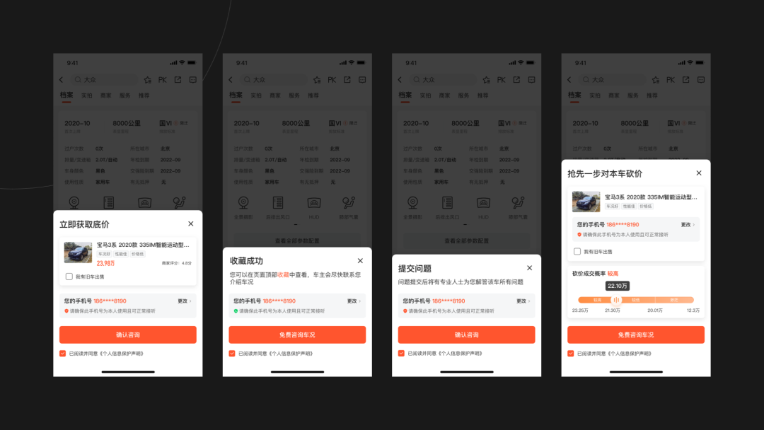 留资的设计过程需要不断的验证。轻量化,成本低的方式更容易为我们所用。设计的过程中需考虑除用户使用成本、设计成本外的研发成本。及时与研发团队沟通方案的实现与延展性,例如在车业务中就使用了很多轻量化的底部浮层方式,并统一弹窗的结构形式,减少研发对于页面框架性的修改。