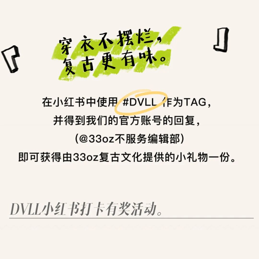 33oz复古文化推出的专属于复古爱好者的每日搭配TAG —— DVLL(即Daily Vintage Life Look),通过每日着装来反映Vintage Life的生活状态。