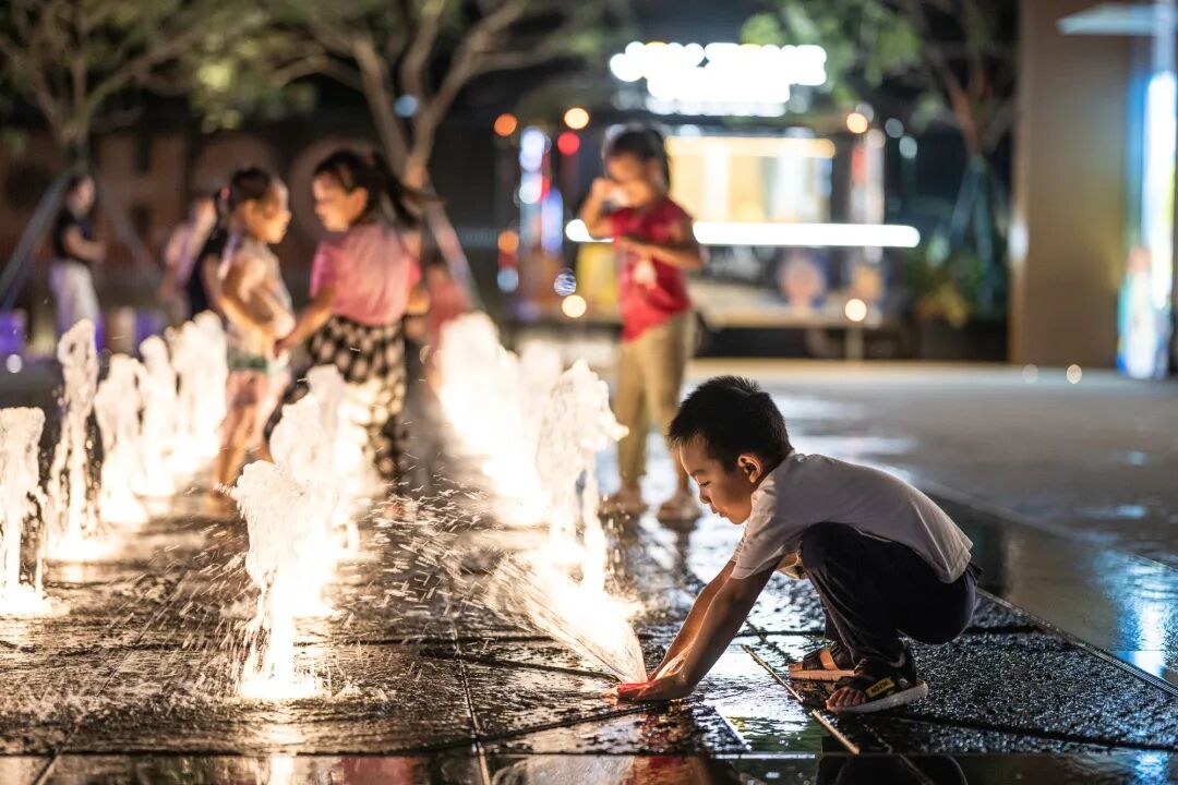 将江泰路特有的人文地图凿于泉上,在孩童参与戏水的过程中,恍若走进过去的时光。