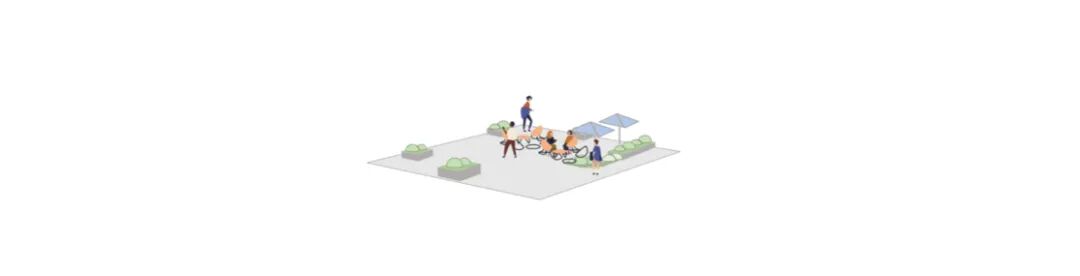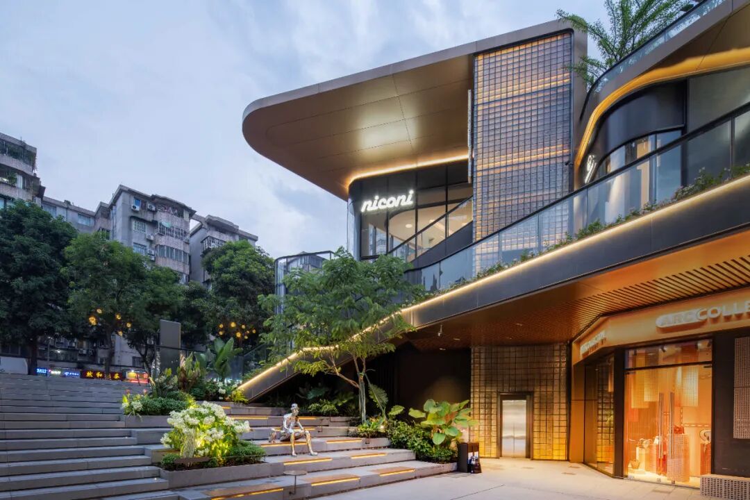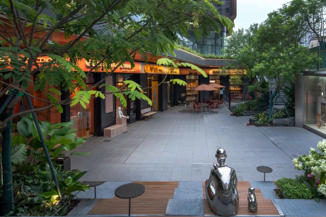如何在极小的空间内满足多元需求,是我们在面对具体设计任务时的出发点。设计通过对空间结构及场地文脉的梳理,结合建筑将整个景观区域规划成三个板块,借助创新的设计语言以及商业的引入,打造成一个开放充满生机同时又极具时尚感的城市空间。